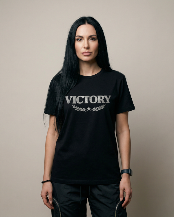 Schwarzes Victory T-Shirt, mit Silber-Glitzer-Effekt – kraftvolles Statement mit Stil (Kopie)