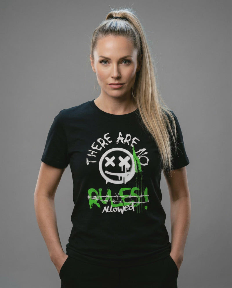 Setze ein starkes Statement mit dem „There Are No Rules“ T-Shirt! Das coole Design mit einem frechen Smiley und dem markanten Schriftzug in Weiß und Neon-Grün bringt deinen rebellischen Style perfekt zur Geltung. Ideal für alle, die sich nicht an Regeln halten und ihren eigenen Weg gehen.